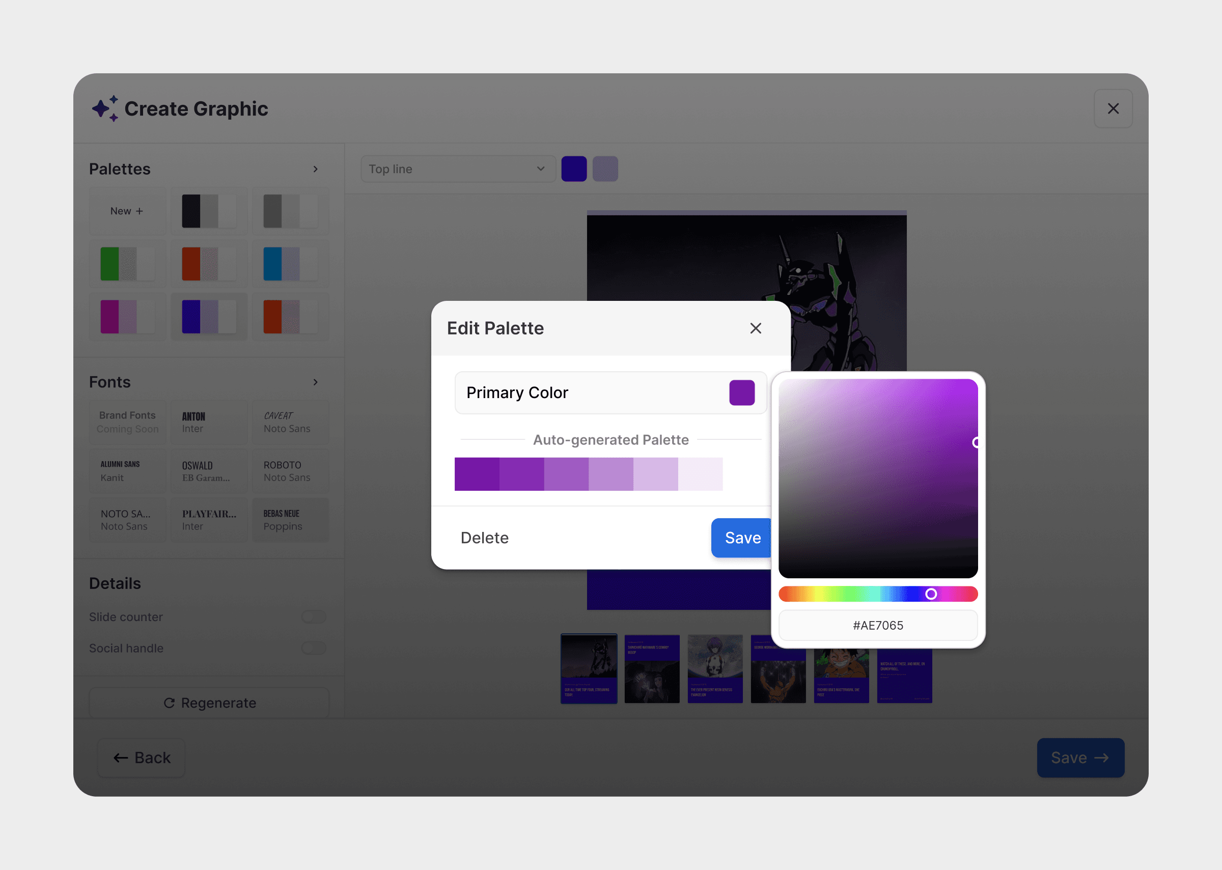 Our primary feature set was generation of brand specific graphic copy, the ability to control colours and fonts, moving key objects on the canvas, and ensuring graphic wide colour and font changes whilst retaining high visual quality.