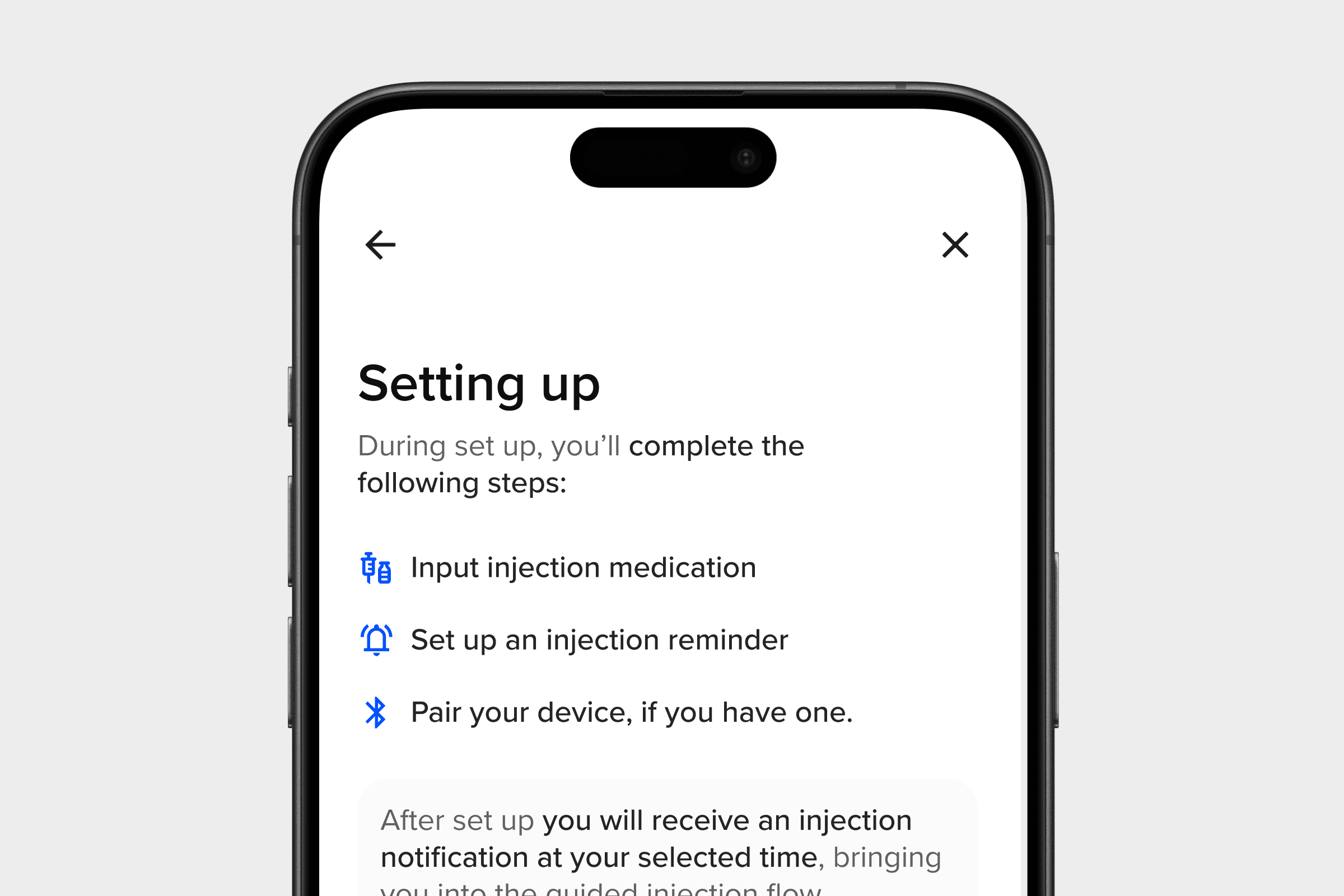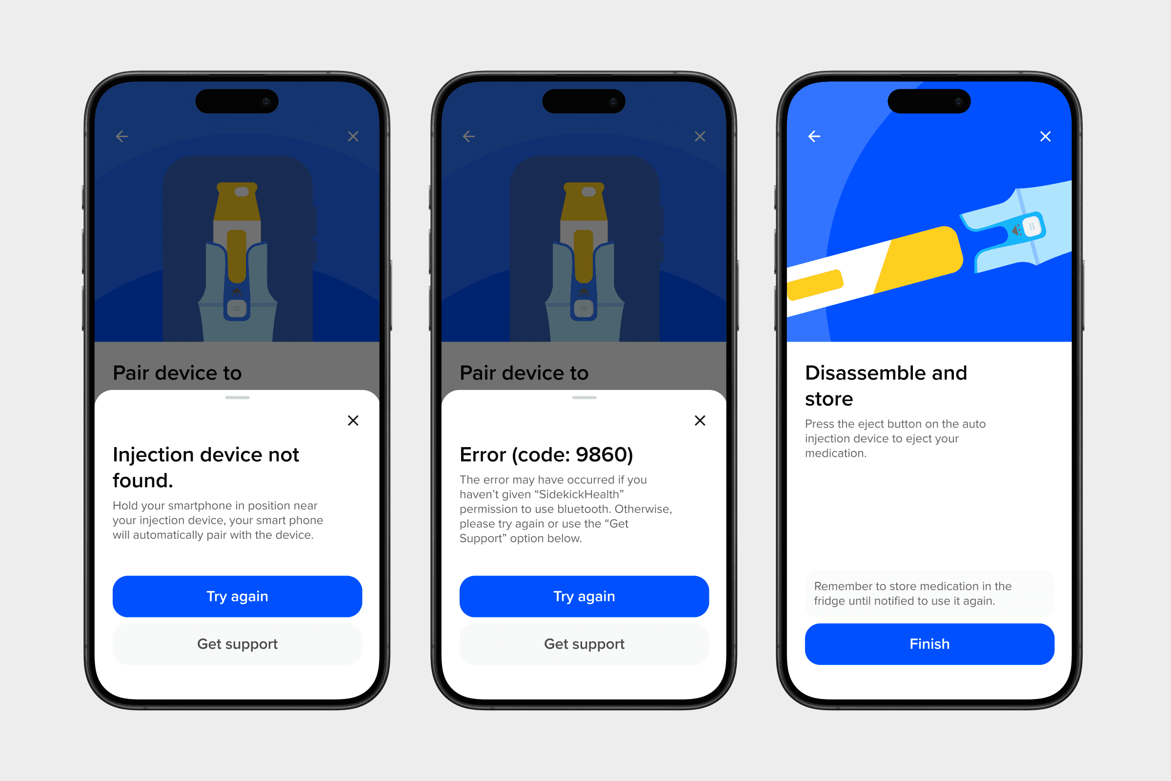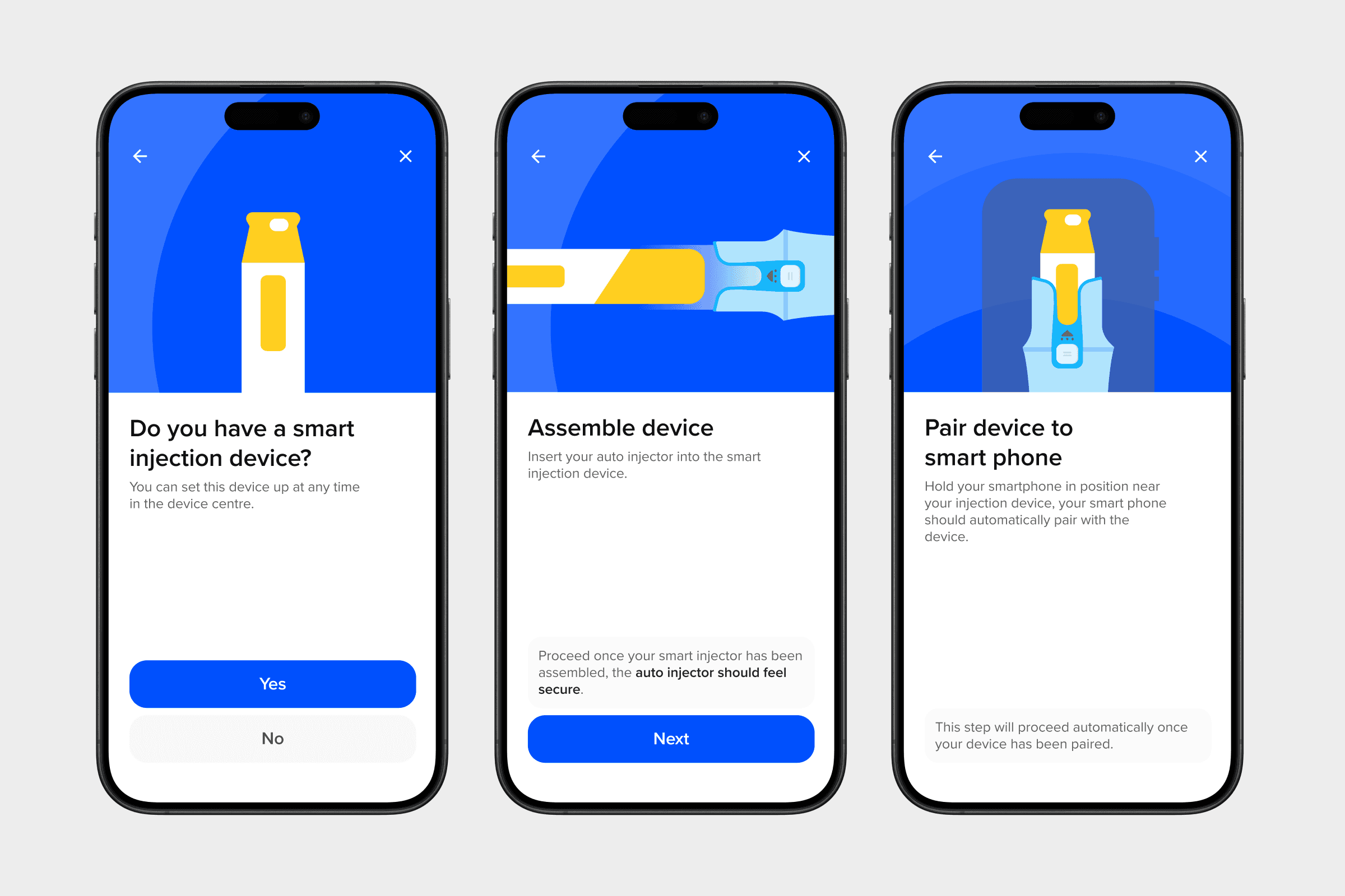 I designed simple illustrations to mimic the physical process of setting up a Bluetooth injection device.